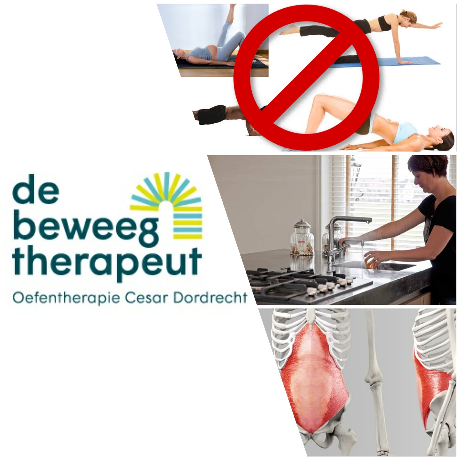 In de anamnese en het onderzoek zag ik dat er weinig stabiliteit werd gemaakt ondersteunend vanuit de buikspieren. Ze leek constant de rugspieren aan te spannen en op die manier de rug over te belasten. Ze had een hoge algehele spierspanning, maar voelde dit niet. Ze had niet in de gaten dat ze bijvoorbeeld het hele gesprek gespannen op het puntje van haar stoel zat met de schouders opgetrokken. Dit laten inzien zodat ze het kan veranderen is ook oefentherapie Cesar /Mensendieck . Ik ben samen met haar op onderzoek gegaan wanneer ze wel of geen spanning voelt in haar spieren. Dit hebben we als aanknopingspunt gepakt om het lichaamsgevoel uit te bouwen en toe te passen in haar dagelijks leven (ADL). Daarnaast hebben we stabiliteitsoefeningen gedaan. Denk nu niet aan iets ingewikkelds, maar we zijn superklein begonnen met zittend een heup optrekken. Ze verloor haar balans al snel bij de gemiddeld lichte oefeningen (superman, bruggetje) dus dat had geen zin; dan oefen je niets en kan je de klachten zelfs erger maken! Om haar genoeg tijd te geven om alles goed te oefenen en te integreren in haar dagelijks leven zie ik haar ongeveer 1 x in de twee weken.